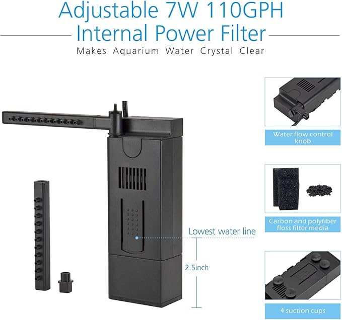 - [ Durable Power Filter ] The aquarium power filter is 7W 110GPH, for 2-8 gallon tank use. It's a super quiet and durable filter, and can be use for low water, the upper part is the 2 stage filtration system, the bottom part is water pumping systerm to pump the water upward. Please NOTE this filter may be too strong for small fish that is not long than 2 inch, may suck small fish, if you keep small in the tank, please don't run the filter or don't run it all the time