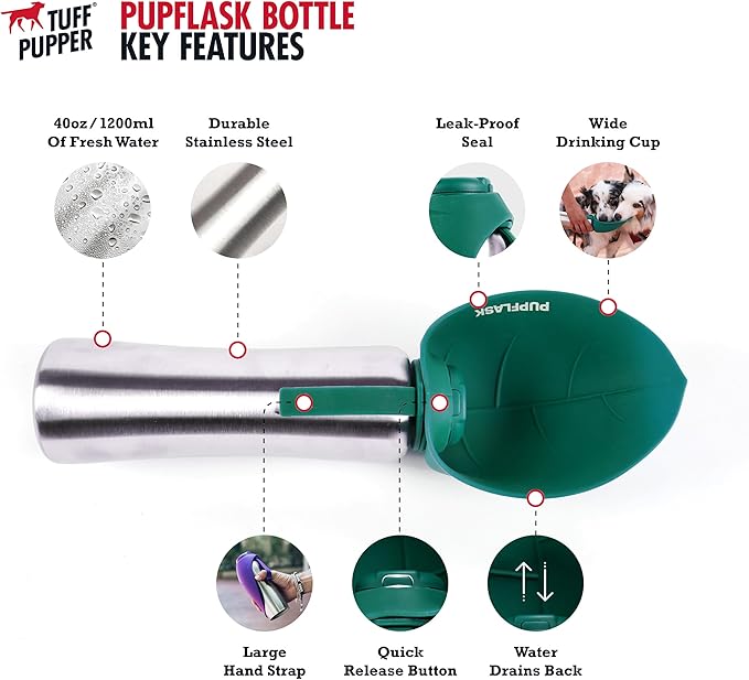 - HAPPY, HYDRATED PETS make the best traveling companions, and the PupFlask goes wherever you and your furry friend venture. Reversible leaf-shaped bowl lays flat over bottle when not in use.