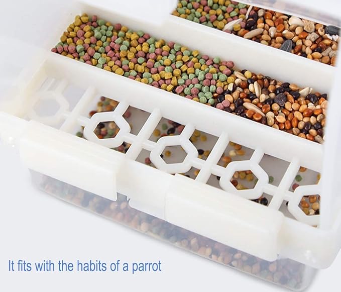 - Easy to Use: This bird cage feeder can be fixed on the external or internal of the cage. There is a feeding trough at the back, and a small tray in front of that that the loose stuff falls into. Easy to remove and dump once or twice a day