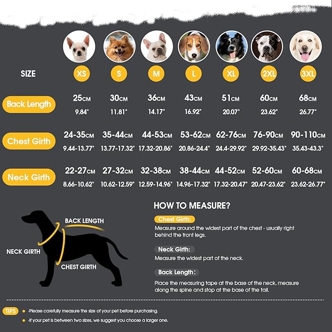 - SIZE INQUIRY: If you don't make sure which size to choose, you can measure your dog firstly then contact us for a recommended size. We are pleased to help you to choose a suitable dog coat for your furry friend.