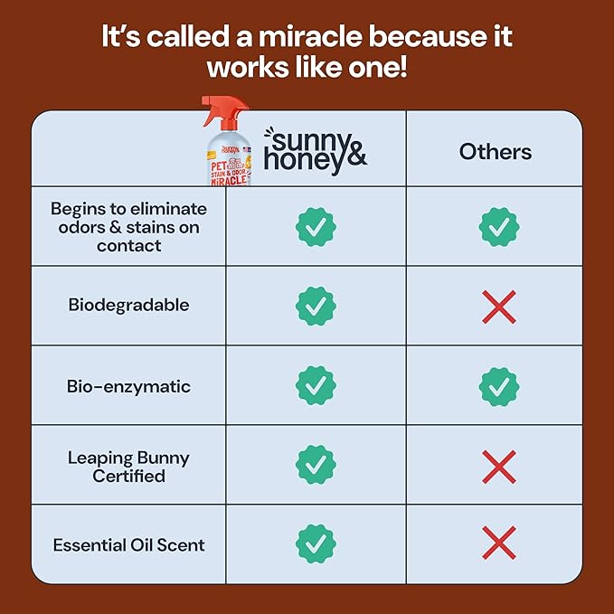 - Sunny & Honey Clean: Sunny & Honey Pet Stain & Odor Miracle makes pet messes vanish with ease. This pet cleaner tackles dog pee, cat vomit, and more, leaving your home fresh and clean without harsh odors