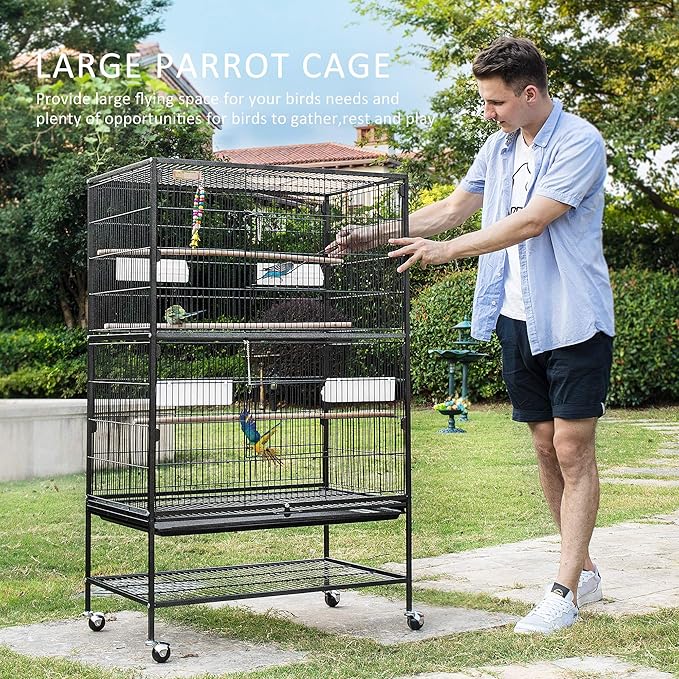 - STURDY FRAME - This large birdcage is made of high-quality, low-carbon, rust-proof, and waterproof steel, with guaranteed quality and durability; Covered with non-toxic hammer-pattern paint, it gives birds a healthier and safer living environment; The steel frame is stable, with 4 caster wheels at the bottom, so you can move it anywhere you like, saving you effort; It has a perfect anti-escape design, and the latch is firm and safe