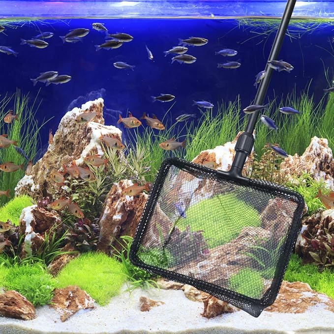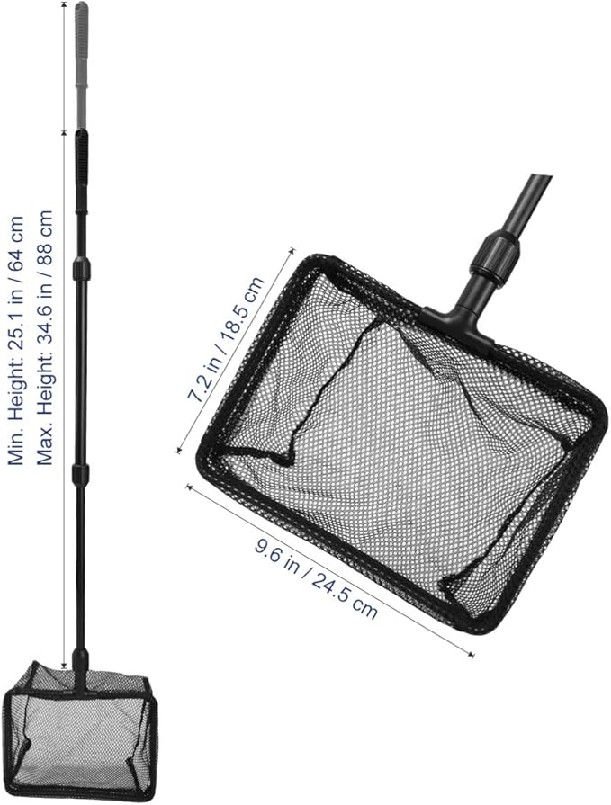 - Adjustable Handle: The aquarium net features a telescopic handle that extends up to 110cm, allowing you to easily reach deep areas of your fish tank or pond while minimizing disturbance to your aquatic environment