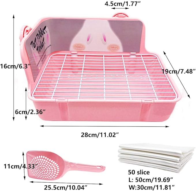 - Size and Range: Its size is 28 cm/11.02 " x 19 cm/7.48 "x 16 cm/6.3 ". Each package includes 1 x bunny litter box, 50 x disposable litter pan liners, 1 x scoop, suitable for small pets such as dwarf rabbits, bunnies, chinchillas, guinea pigs, rats, ferrets, sugar gliders and hedgehogs, etc. Please note that our rabbit litter box is suitable for bunnies, not for adult big rabbits, it is recommended to measurement the size of your rabbit before you bid