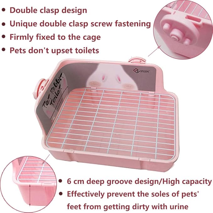 - Heightened Bottom and Meshes: The bottom of our bunny potty pan has been deepened so that it could contain more litter. The meshes are used to divide the feet of your pet and the excretion, prevent stick, they have also been heightened so that the potty pan won't collapse and the urine won't splash to everywhere, prevent mess in the cage
