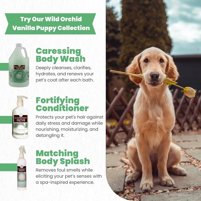 - For Dogs and Cats: Our Scentament Spa Caressing Body Wash is suitable for dogs, cats, puppies, and kittens over 12 weeks old. The shampoo is available in a 1-gallon bottle and can economically dilute up to 10:1. Matching body splash is also available.