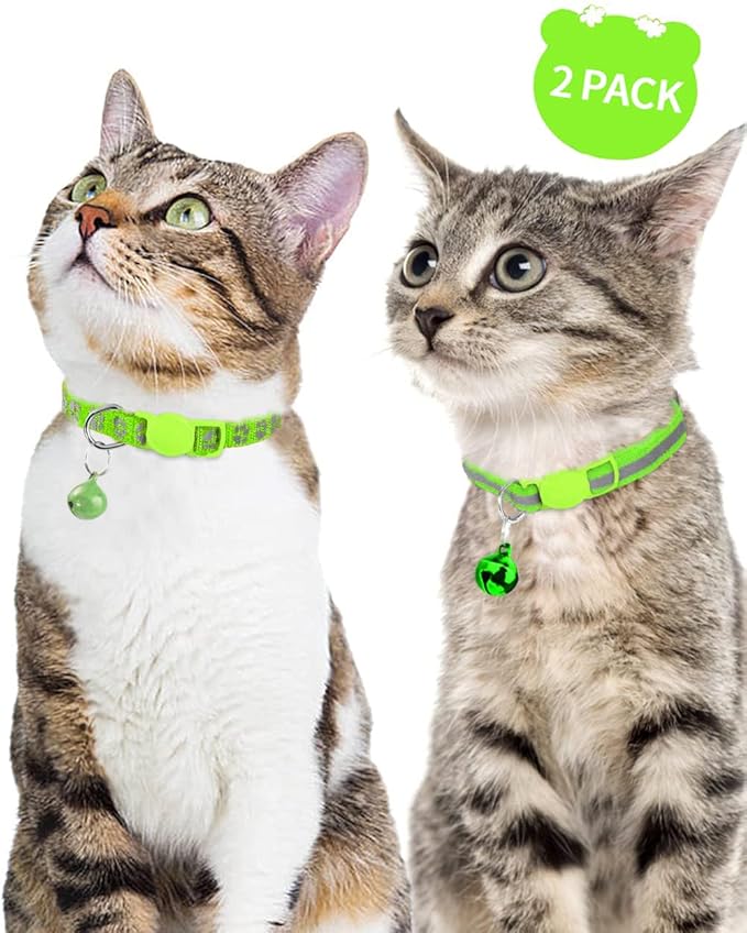 Taglory Reflective Cat Collar Breakaway with Bells, 2 Pack Girl Boy Pet Cat Collar Adjustable 7.5-12.5 Inch, Green