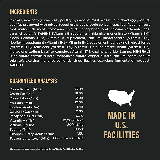- Chicken is the first ingredient in this high dry protein cat food with rice to support muscle strength