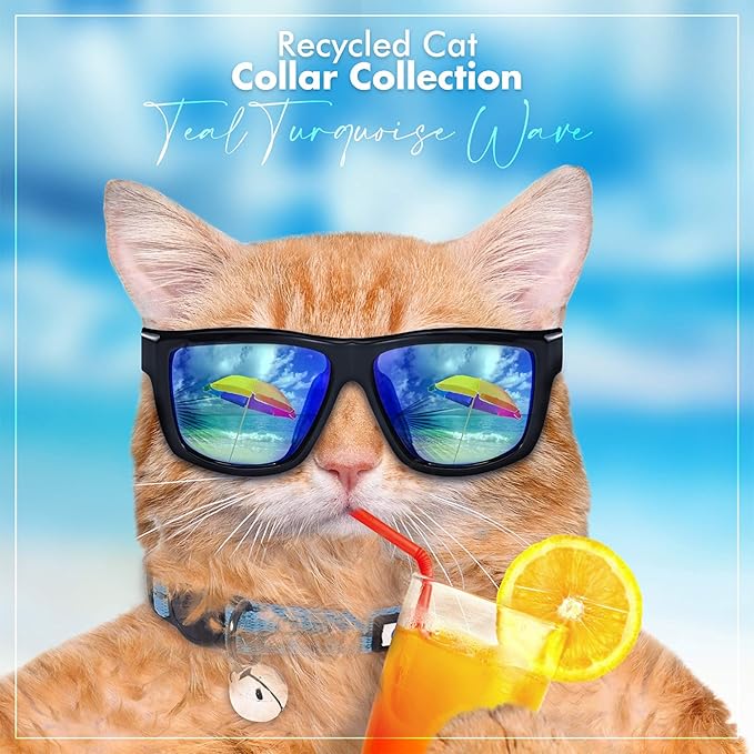 Pawtitas Recycled Cat Collar with Reflective Stitched and Safety Buckle Removable Bell Reflective Cat Breakaway Collar Made from Plastic Bottles Teal Turquoise Wave Cat Collar
