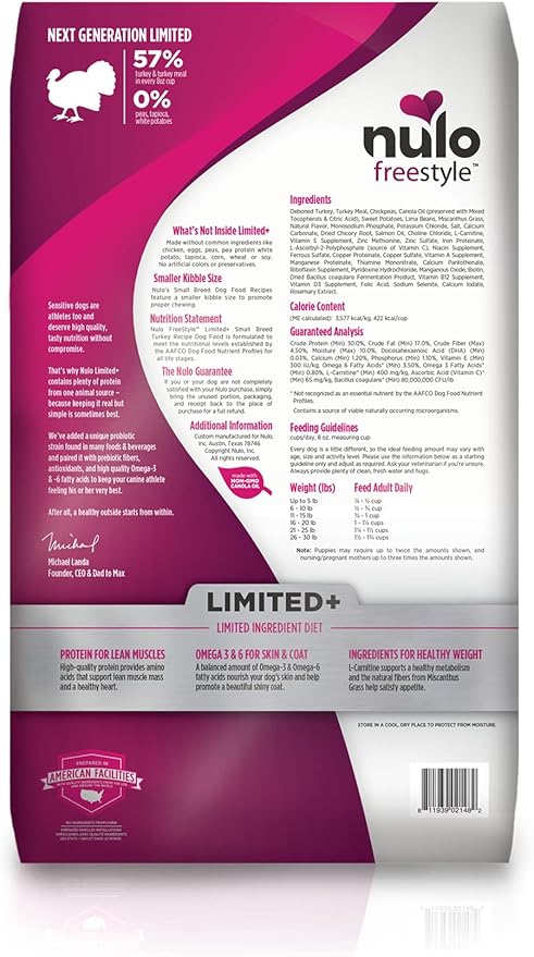 - Limited Ingredient Dog Food for Small & Toy Breeds – Nulo Limited+ Small Breed Turkey recipe is a grain-free, single-protein food for small dogs, toy breeds, and puppies with food sensitivities. Made with real turkey and no chicken or artificial additives.