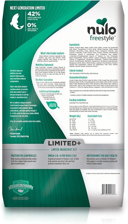 - Limited Ingredient Dog Food – Nulo FreeStyle Limited+ Alaska Pollock & Lentils Recipe is a grain-free, single-protein dog food designed for dogs with food sensitivities. Crafted with real pollock and no chicken, eggs, or artificial additives.