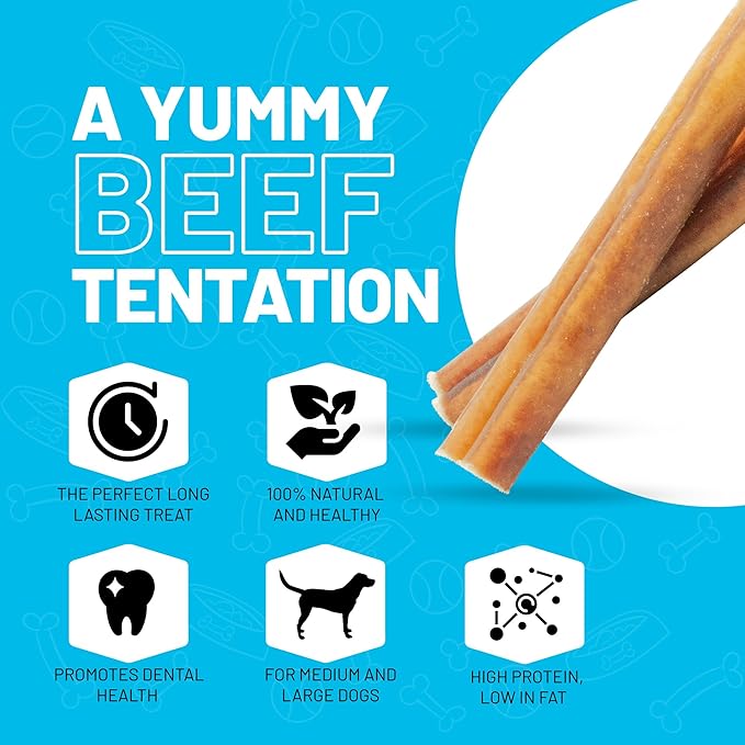 - LONG LASTING : These Bully Sticks are thicker than our standard Bully Sticks, ranging from 25 to 40 percent in size. They are designed to keep your dog entertained, satisfied, and energized, making them perfect for frequent use! These dog treats are carefully crafted by a USA-based company that is committed to providing nutrition and happiness with a delicious and savory beef flavor.