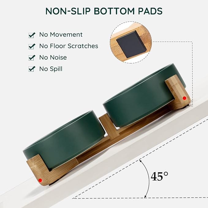 SPUNKYJUNKY Ceramic Dog and Cat Bowl with Wood Stand Non-Slip Matte Glaze Weighted Food Water Set for Cats &Small Dogs 13.5 OZ Green