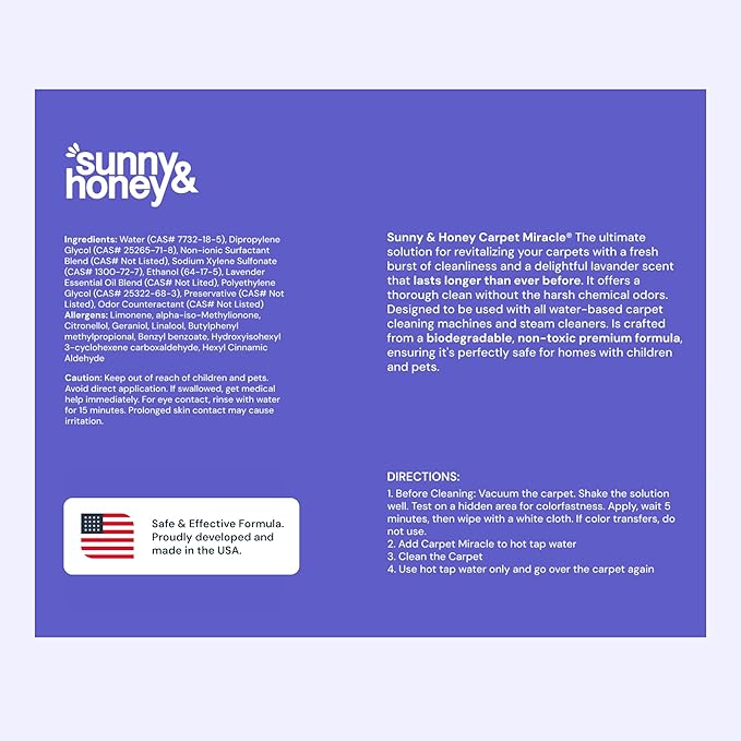 - Sunny & Honey Power: Dive into carpet cleaning with Sunny & Honey Carpet Miracle, a carpet cleaner solution for machines that tackles tough spots. Whether it’s pet mishaps or everyday messes, this pet carpet cleaner solution has your back