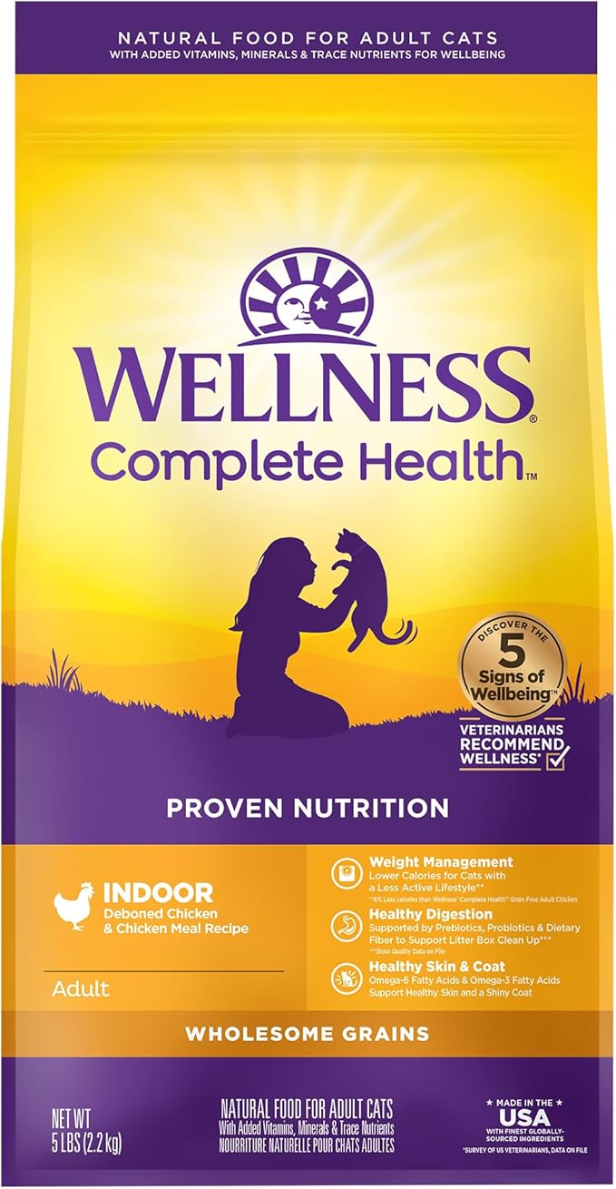 Wellness Complete Health Adult Dry Cat Food for Indoor Cats, Wholesome Grains, Natural, Chicken (5 Pound Bag)