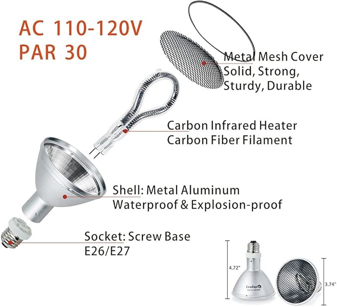 - 【Specification】 75W; AC 110-120V; E26/E27 lamp base; PAR 30; 3.8 x 3.8 x 4.7 inches. Material: Carbon Fiber Filament, Metal Aluminum. The high-strength metal shell makes it waterproof and explosion-proof, suitable for high humid environments. Stronger than the reptile ceramic heat emitter.