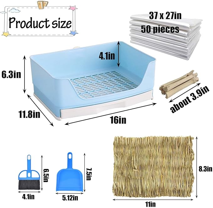 - Packaging includes: When you order, you will receive these things: 1 x large rabbit litter box, 1 x grass mat, 1 x mini dustpan and brush set, 5 x sweet bamboos and 50 pcs thin rabbit cage liners