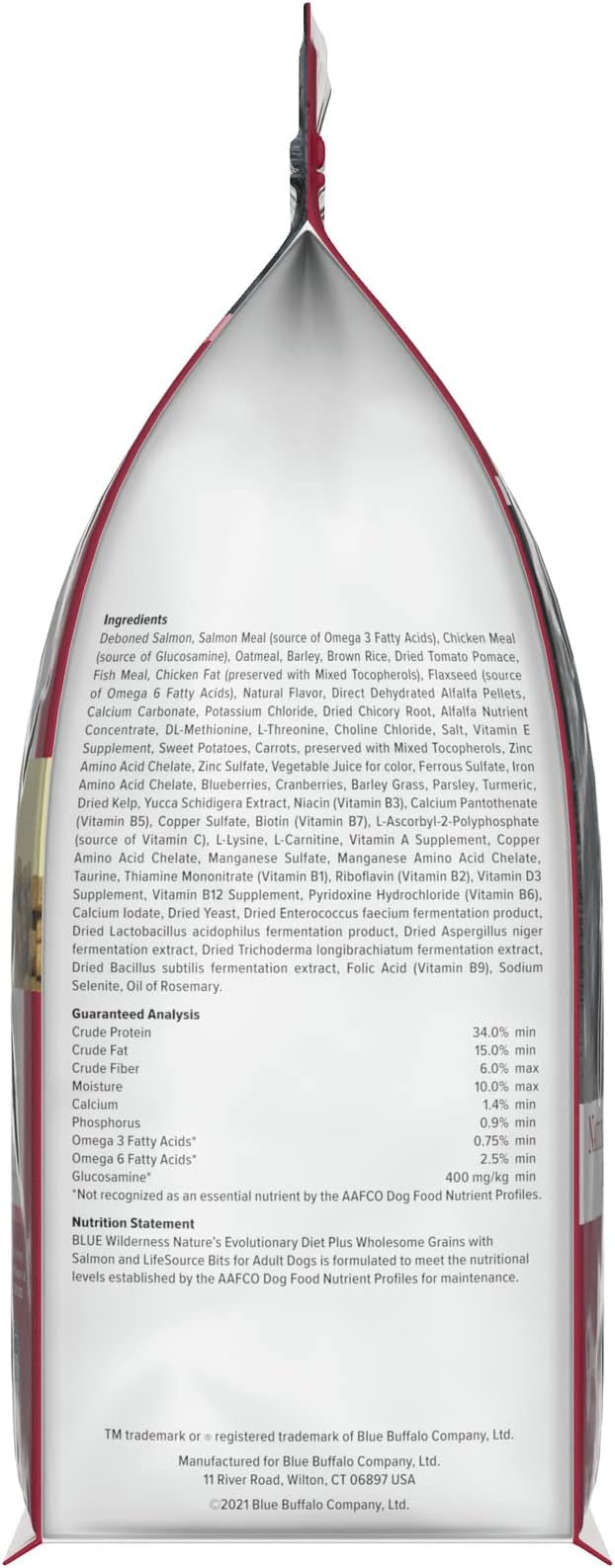 - Contains one (1) 4.5-lb bag of BLUE Wilderness High Protein Natural Adult Dry Dog Food plus Wholesome Grains, Salmon