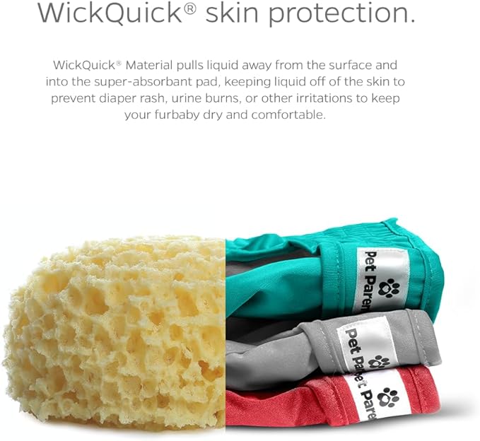- HIGHLY ABSORBENT DOGGIE DIAPERS: Because we know your Great Dane 'goes' more than your Chihuahua, the diaper pad that is sewn into our dog diapers female increases with the size, because bigger dogs = more liquids. WickQuick material wicks liquid from the surface and into the dog period diapers, keeping your furbaby dry and reducing urine burn or irritation. Our diapers also have a waterproof outer layer to prevent leaks and damage to rugs, carpets, upholstered chairs and sofas.