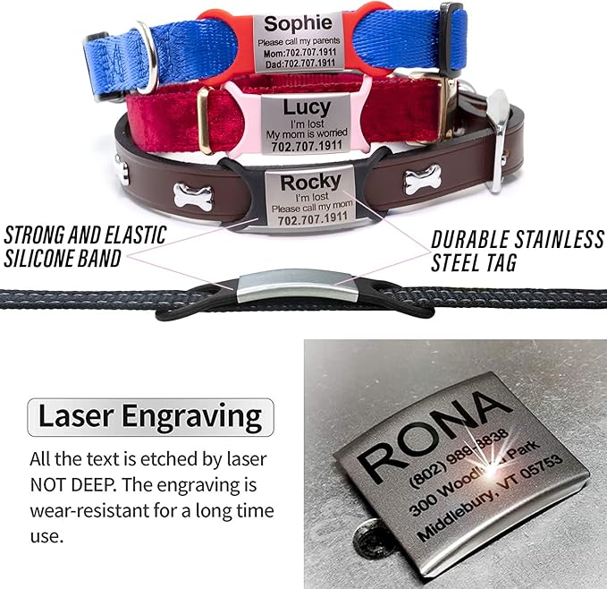 - ๐ Laser Engraved Pet ID Tags: Rest assured, the laser engraved, clear text on your personalized dog collar tag or personalized cat collar tag will look great and will not fade. Attach your engraved pet tag to your pet's collar or harness.