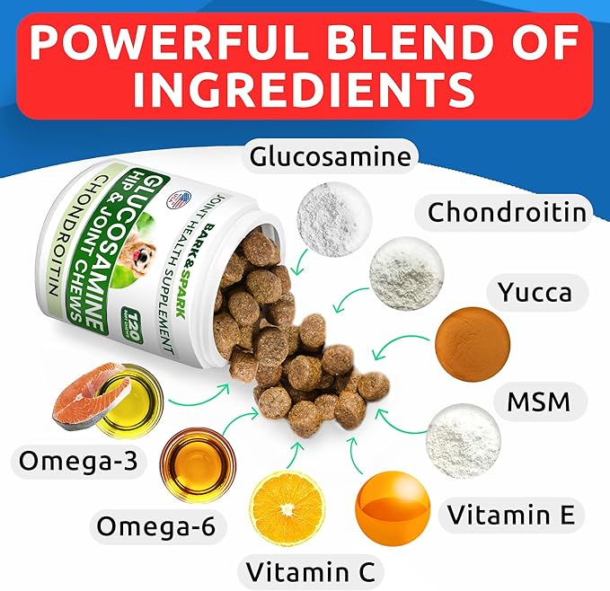 Bark&Spark Glucosamine Chondroitin Dog Hip & Joint Supplement - Joint Pain Relief - Hip & Joint Chews - Joint Support Large Small Breed - Senior Doggie Vitamin Pill Joint Health (120 Treats - Chicken)