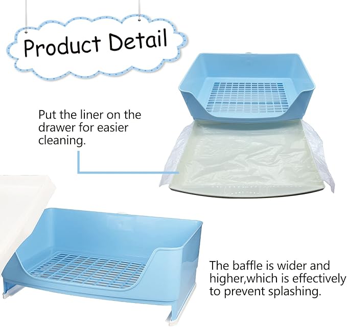 - Easy to Clean: The mesh is the right size to allow feces to leak without trapping your pet's feet. Rabbit litter box with drawer helps you save time. Put the liner first. Then clean the grid with a broom and rinse with water. Just lift the liner by the four corners and throw it away.