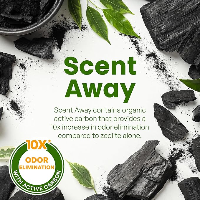 - EXTENDS CAT LITTER LIFE - Not only does Scent Away cat litter deodorizer remove odors from cat litter, it improves moisture holding capacity and extends cat litter life naturally with its active carbon ingredient. It also helps the environment, removing harmful greenhouse gasses from the atmosphere.