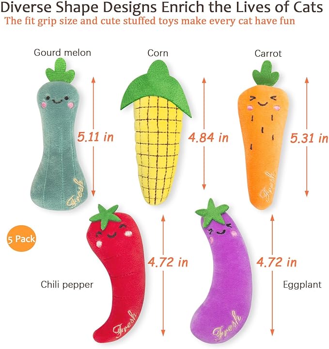 - Cat Game Farm Vegetables Theme: 5 Colors and shape, catnip carrot, pickle, corn, chili, eggplant, assign toys of different colors to track your furry baby's activities. Your cat will love this fun toy, every pounce and bite can increase their playtime