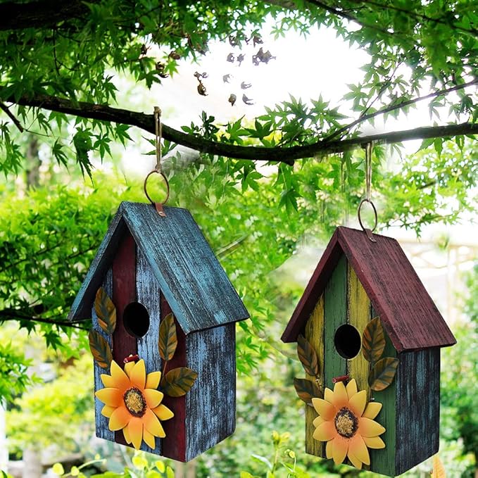 - Decorative Birdhouses for Outdoors - Wood garden birdhouse decor is hand painted with rustic look. Metal sunflower decor with bright colors makes it stand out. Attract wild bird like wrens and chickadees to your garden or backyard with this whimsical birdhouse for outside display.