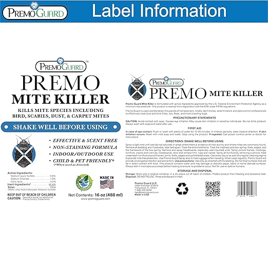 Premo Guard Mite Treatment Spray – 16 oz – Kills Dust, Scabies, Spider, Carpet, Bird, Mouse & Rat Mites in Home, on Furniture, Bedding – Natural Non-Toxic 100% Effective – Child & Pet Safe