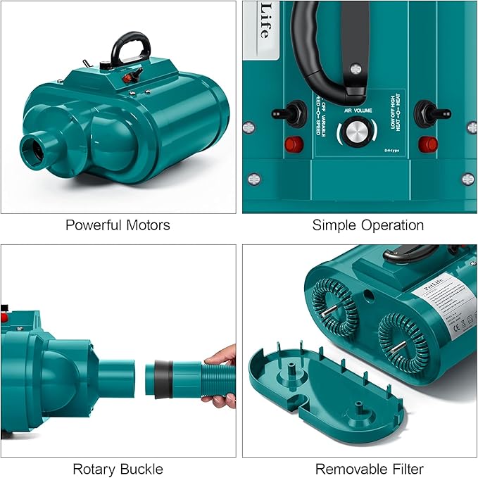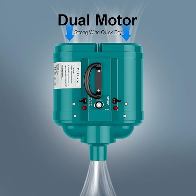 - 【Most Powerful Force Air Dryer & Variable Speed】PetLife professional high-velocity dog hair dryer are designed with two powerful motors, output power could be up to 5.0 HP, the strong wind could dry your dogs very quickly and save a lot of time. Motors could work independently or simultaneously, so it is the best choice for medium and large dogs. The variable speed could be adjusted from 18 m/s to 100 m/s, everything is in your control.
