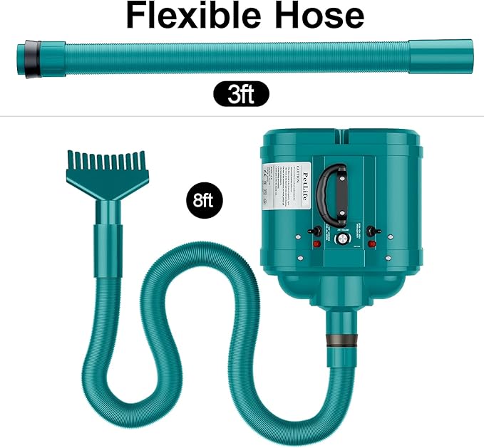 - 【Flexible Hose & Easy to Use 】The pet grooming dog dryer’s flexible hose could be up to 8 ft, it is long enough for your home or store pet drying work, only few buttons on the panel, you can master how to use it easily.