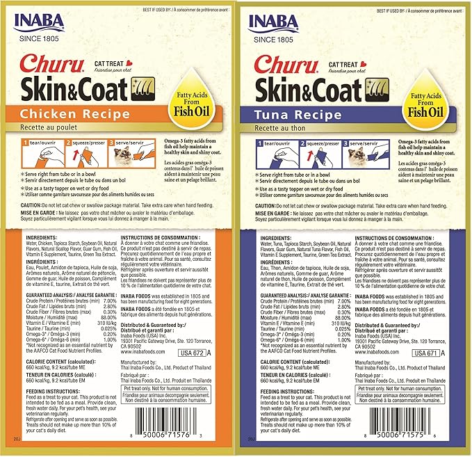 - FUN AND FUNCTIONAL: Like our original Inaba Churu Cat Treats, these tubes are a low-calorie treat that helps with hydration. But we've also packed them with Omega-3 fatty acids from fish oil to help maintain healthy skin and a shiny coat