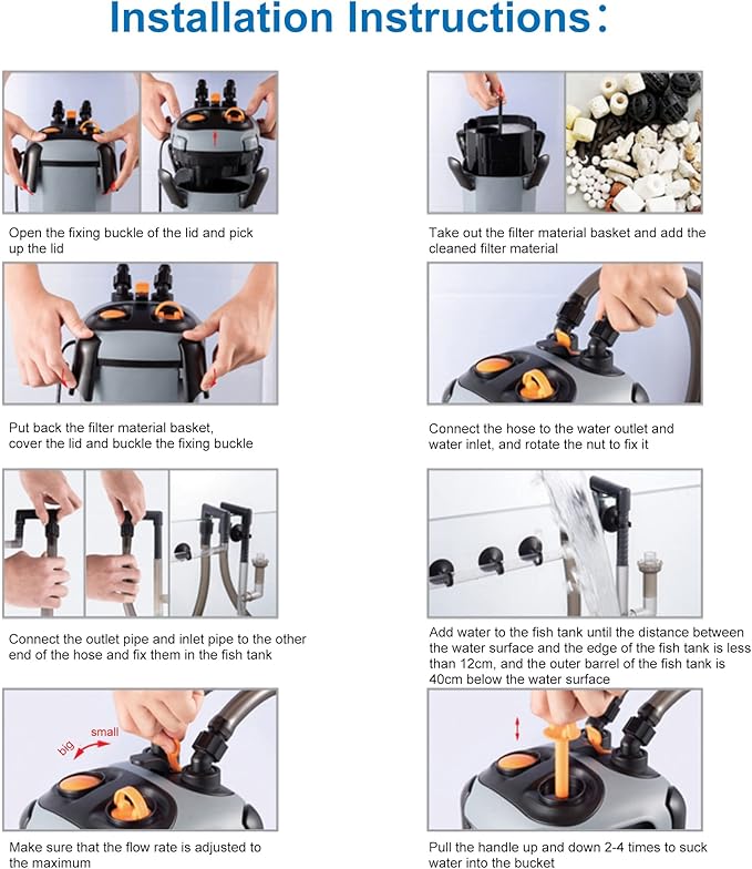 - Filter Foam pads screen out dirt and debris.Fills filter chamber with water for self-priming system startup.Please refer to the 6th main picture for the operation guide, the last main picture for operation precautions. If you find any problems in the process of operating the machine, please feel free to contact us, 24 hours online service for you!