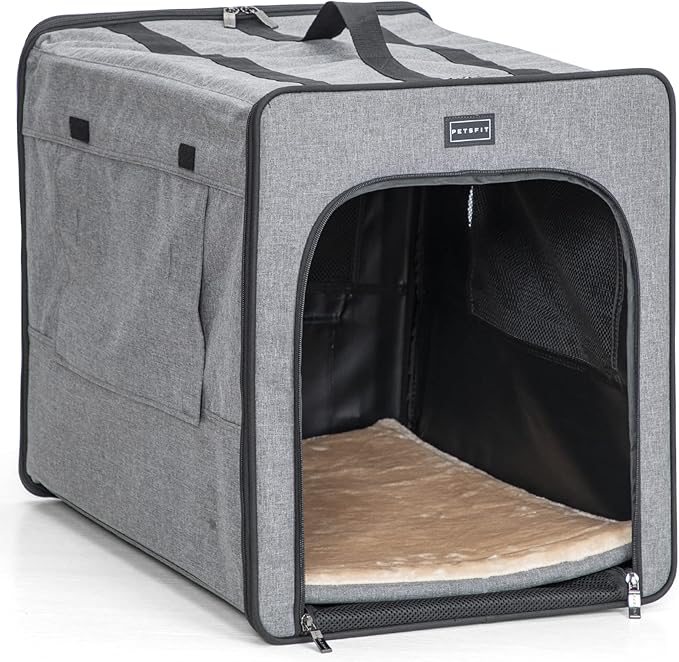 PETSFIT Travel Dog Crate, Soft Sided Dog Crate - 24 Inch with Thicken Mat, Easy to Fold, Sturdy and Portable, Perfect for Traveling, Portable Dog Kennel Grey