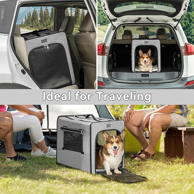 - Indoor & Outdoor Use: Versatile travel dog crate for every adventure, our crate is the ultimate solution for pet owners on the move. Ideal as an indoor dog kennel at home, a travel dog crate for car, and a dog tent for outdoor camping, whether you’re embarking on a road trip or setting up camp outdoors. With this crate, transitioning from home to adventure is as simple as it gets, keeping your pet secure and snug in any setting.
