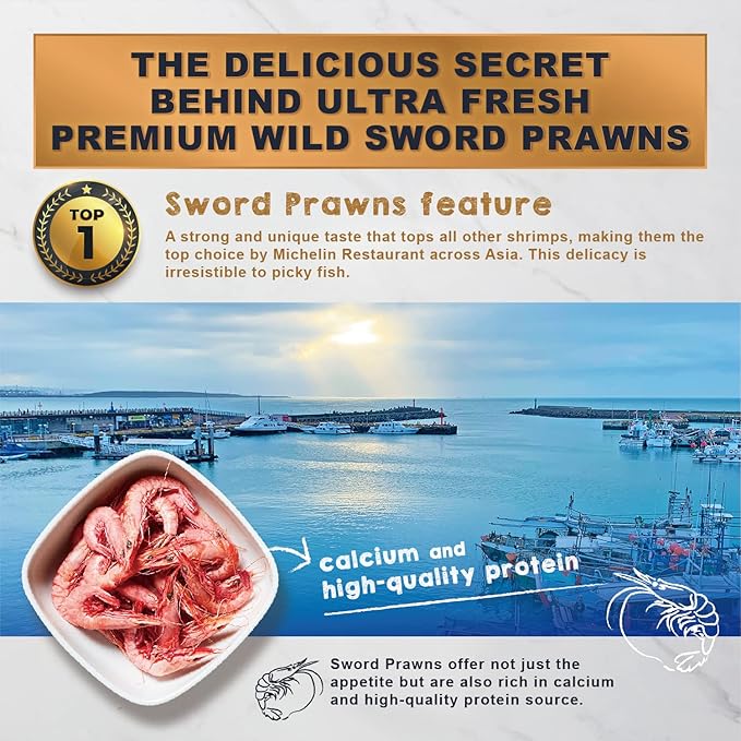 - High Palatability : Sword Prawn Flavor - A blend of wild sword prawns, akiami paste shrimp, vegetables and seaweed. A perfect 6:4 meat/vegetable protein ratio