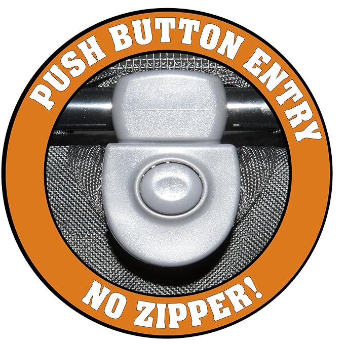 - Push button easy-locking, NO-ZIP entry; 600 Denier water-resistant material; top and front mesh windows for ventilation