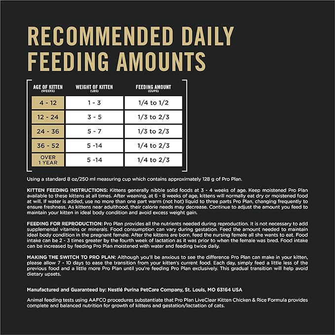 - Discovered through over a decade of research, Purina Pro Plan LiveClear kitten formula significantly cuts the major allergen in cat hair and dander by 47 percent on average in the 3rd week of feeding