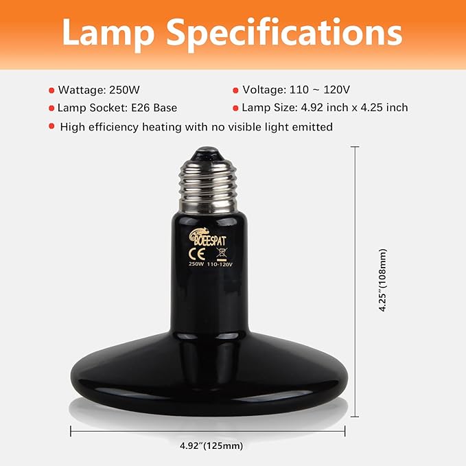 - BOEESPAT reptile ceramic heat lamp emits natural heat without any light, so it won't disturb the sleep of reptiles or pets. Adopted material into ceramic raw materials, thermal efficiency can be up to 99%.