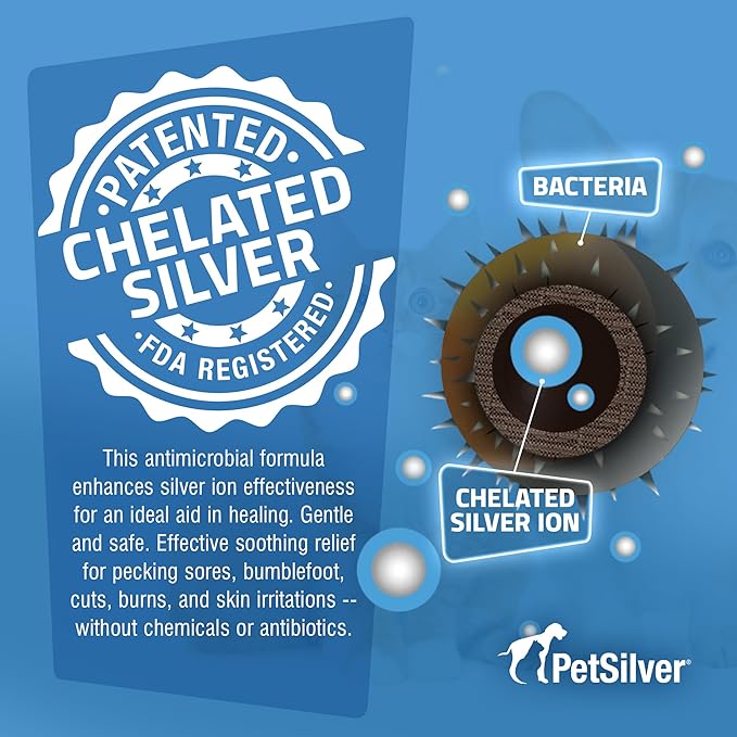 - SILVER PROTECTION: This formula helps cleanse wounds while creating a protective barrier over the affected area during the healing process. Chelated silver is bonded to non-metallic ions and evenly dispersed throughout the solution, enhancing its effectiveness as a chicken wound spray for optimal chicken health.