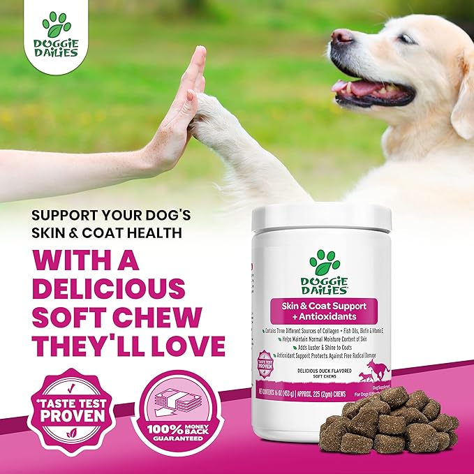 Doggie Dailies Skin & Coat Supplement + Antioxidant Support, 225 Soft Chews, Salmon Oil for Dogs Skin and Coat with Collagen, Omega 3, Krill Oil, Biotin, & Coconut Oil for Dogs (Salmon)