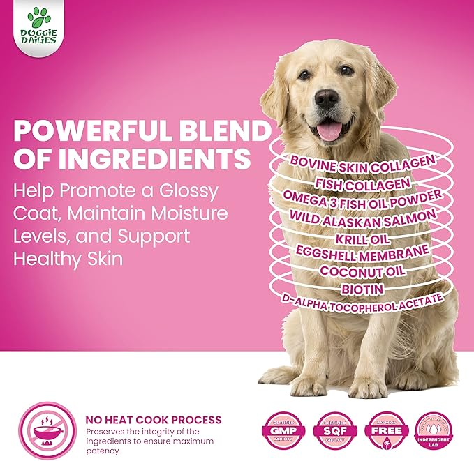 - Three Sources of Collagen to Help Hydrate Skin & Helps With Excessive Shedding: Collagen is critical for a healthy dog, 70% of the protein in your dog’s skin is collagen, and it makes up to 70% to 90% of a dog’s muscles, tendons, and ligaments. That’s why every chew is packed with a premium collagen blend derived from bovine, fish, and eggshell membrane to support a healthy coat, hair growth, strong nails and healthy joint function.