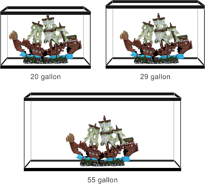 - This ship consists of 2 pcs (22.50in total length x 14.96in tall x 5.90in wide) with holes that provide a great hideaway / hideout for small fish. HINT HINT! Perfect as a Christmas gift / decorations!