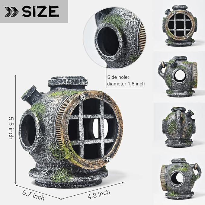 - Size: 4.8*5.7*5.5 inch. Suitable for small and medium-sized fish tank decor. There are holes in the aquarium ornaments, and your cute pet beta or other small fish will be very happy to go in and out of the trunk cave to sleep, rest, hide, and play