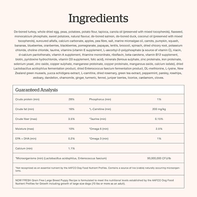Now Fresh Grain-Free Large Breed Dry Puppy Food with Turkey, Salmon & Duck, Healthy Kibble for Growing Dogs with Real Meat & Fish, Chicken-Free, Pumpkin & Probiotics for Good Digestion, 25 lb Bag
