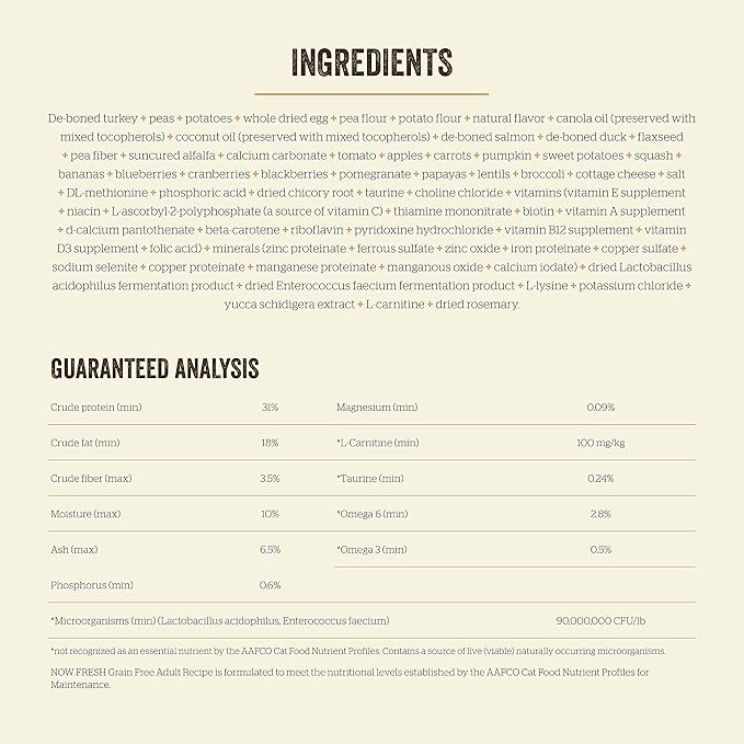 Now Fresh Grain-Free Dry Cat Food with Turkey, Salmon & Duck, Healthy Kibble for Adults Made with Real Meat & Fish, Chicken-Free, with Pumpkin & Probiotics for Sensitive Stomachs, 3 lb Bag