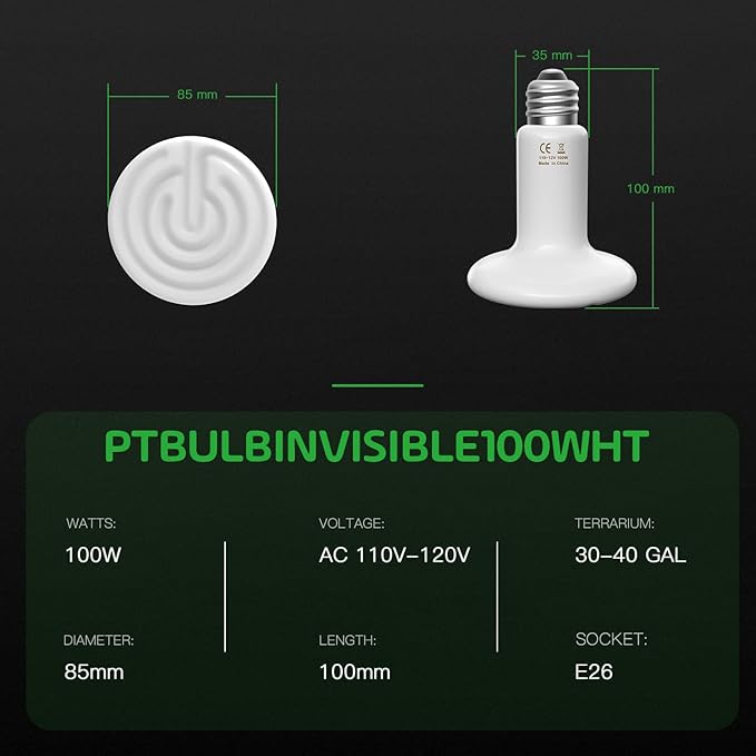- Specification: Voltage: AC 110-120V; Power: 100W; Material: ceramic, metal, NiCrAl; The ceramic heat emitter for use in standard E26 lamp base and easy to install, rated for up to 10, 000 hours. Suitable for 30-40 Gal tank. Heat Lamp Diameter 85mm, length 100mm