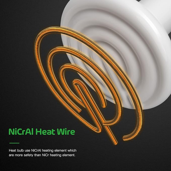- Spiral surface design: Longer filament increases the filament resistance, expands the heating area, and increases the filament temperature in short time. Nickel-chromium alloy resistance wire increases heating speed and area, reduces energy consumptions