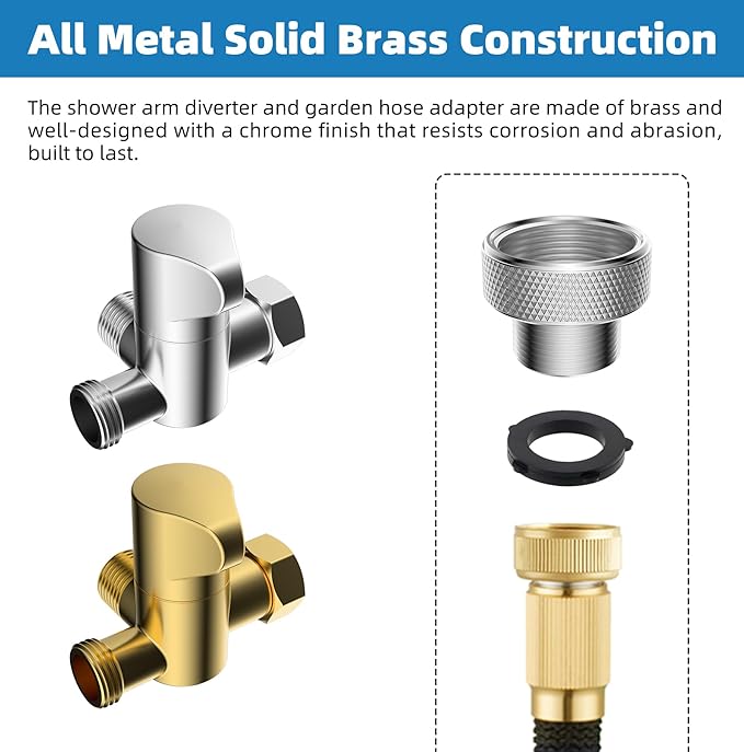 - Brass Shower Diverter & Garden Hose Connector: This shower diverter and garden hose connector are made of solid brass, have a smooth surface and are chrome-plated, which can withstand water pressure changes and daily rust. The 3-way shower diverter smoothly transitions water flow from the handheld sprayer to the fixed shower using the ON/OFF valve. The standard 3/4 inch GHT garden hose connector is compatible with all garden hose types. You can save much time using the quick connect to install your garden hose.